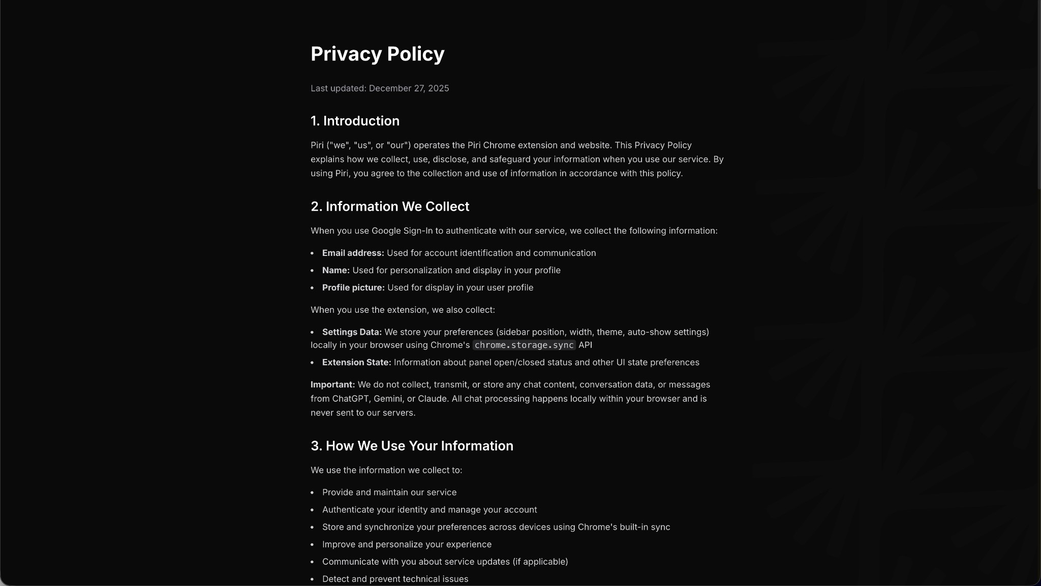 Piri ("we", "us", or "our") operates the Piri Chrome extension and website. This Privacy Policy explains how we collect, use, disclose, and safeguard your information when you use our service. By using Piri, you agree to the collection and use of information in accordance with this policy.